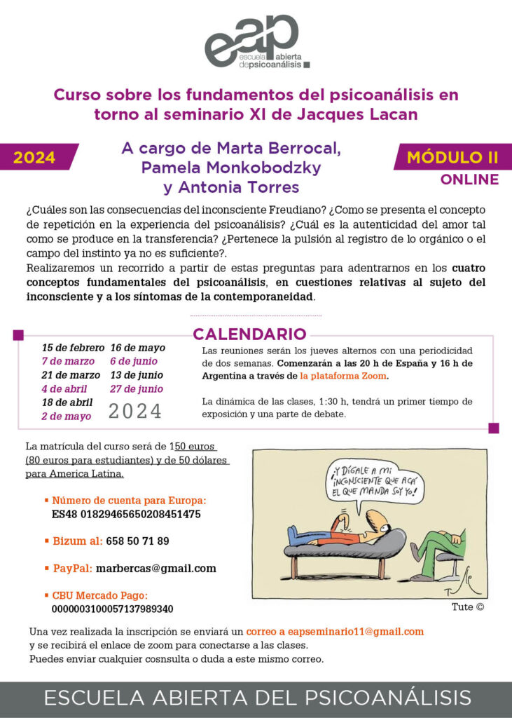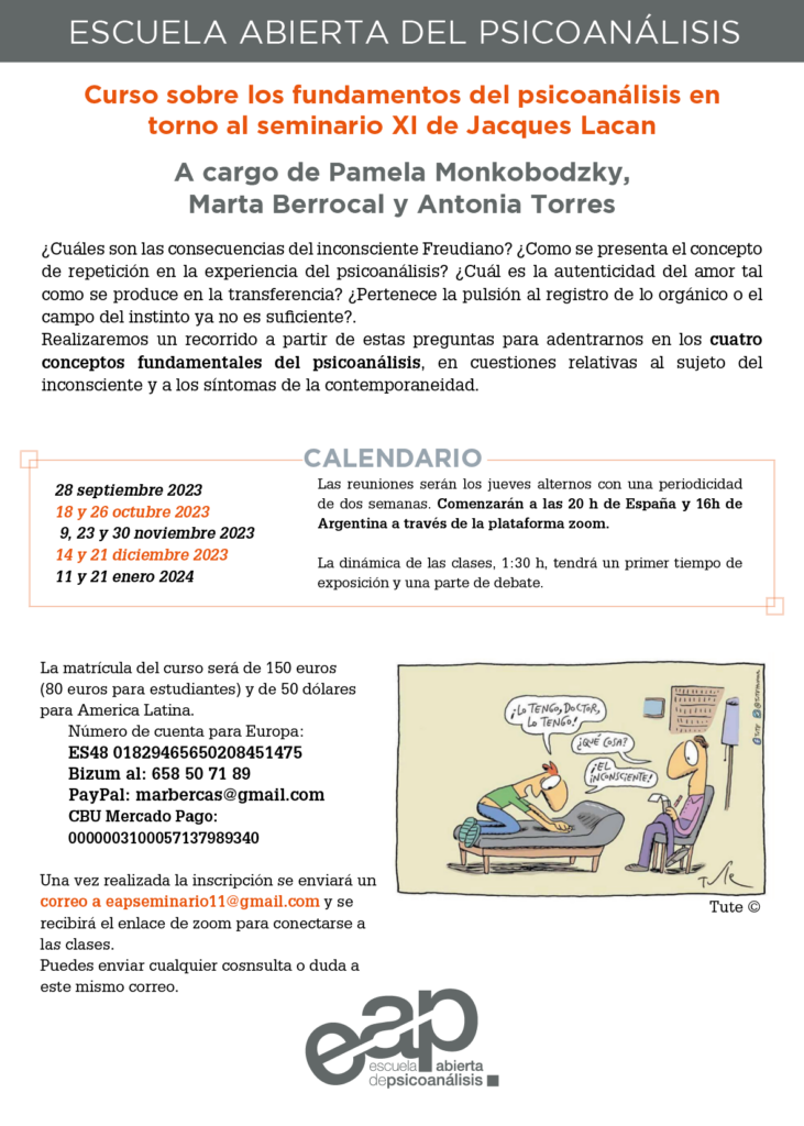 Realizaremos un recorrido a partir de estas preguntas para adentrarnos en los cuatro conceptos fundamentales del psicoanálisis, en cuestiones relativas al sujeto del inconsciente y a los síntomas de la contemporaneidad.