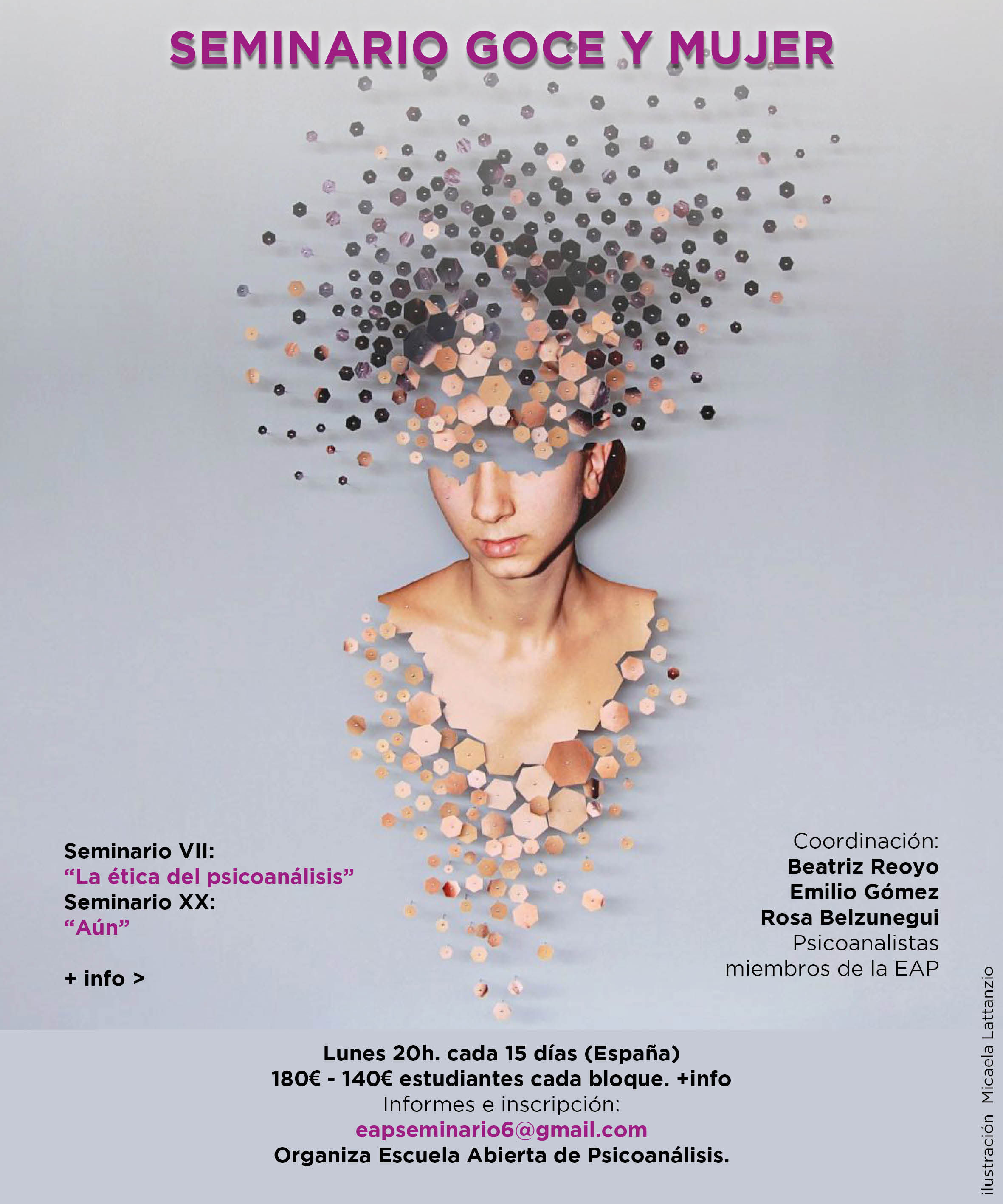Comenzamos esta nueva andadura con una nueva propuesta, trabajar el tema del goce y la mujer. Para ello hemos dividido el curso en dos bloques, cuyos soportes son el Seminario de La ética del psicoanálisis y el Seminario Aún de Jacques Lacan. ¿Por qué esta propuesta?, porque para abordar lo femenino y lo masculino no basta con ceñirse al amor, muchas veces se dice que el amor de la mujer es simbólico y el del hombre real, no descartamos esto, pero también es necesario abordar el campo del goce, eso que trabaja en silencio, para darse cuenta que muchas veces esas diferencias no son simplemente de oposición. Tanto un seminario como el otro son cardinales en la obra de Lacan, en el seminario 7 aborda los problemas para trazar las vías por las que el psicoanálisis freudiano se ha de mover para no obturar su espíritu, deja algunas cuestiones abiertas que continúan en el seminario 20 con nuevas preguntas acerca del saber y del goce.